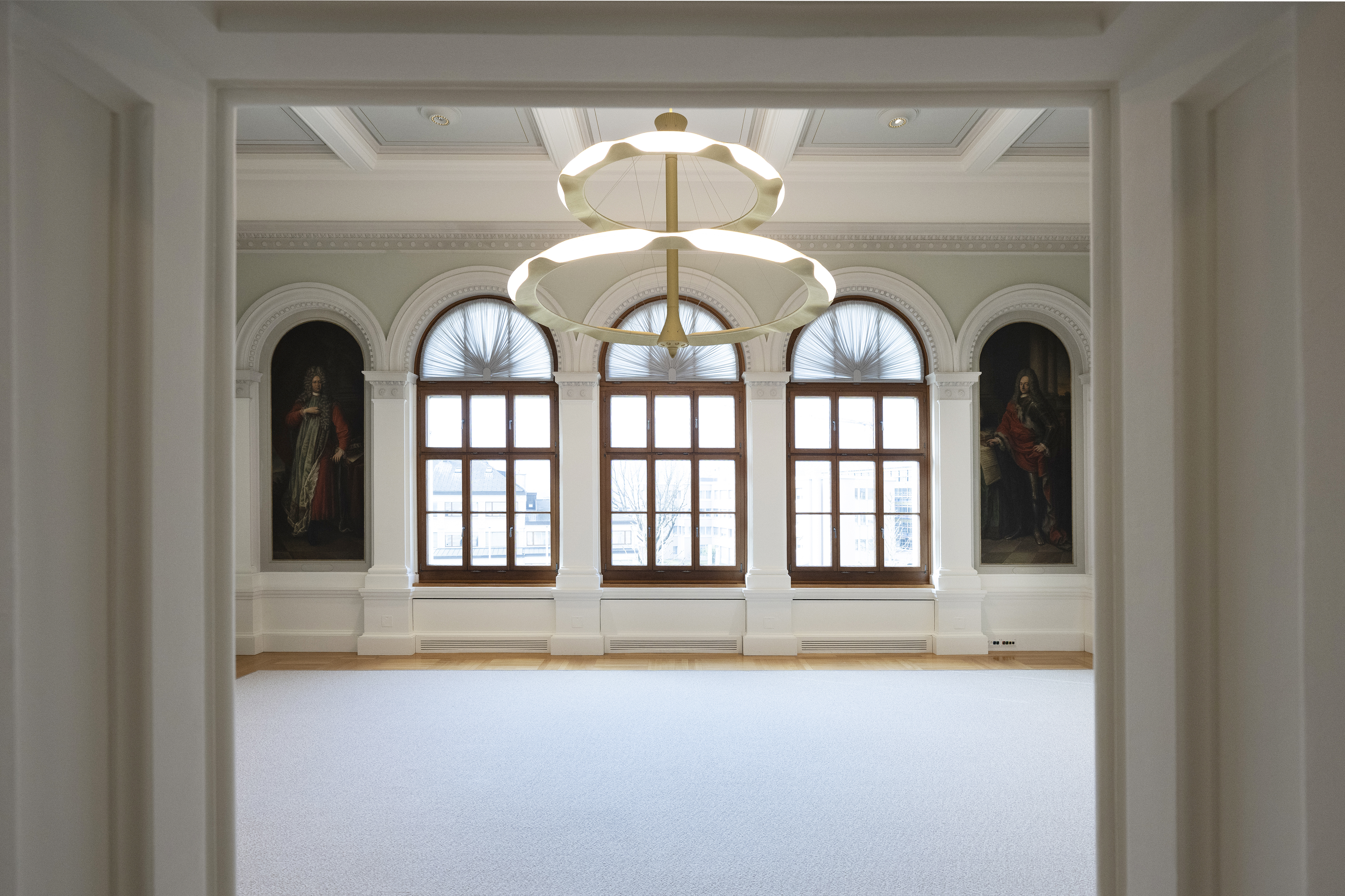 Neben seiner primären Funktion als Lichtquelle entfaltet der Kronleuchter eine starke visuelle Wirkung. Durch seine markante Form, seine beeindruckenden Dimensionen und das durchdachte Lichtkonzept prägt er das Ambiente des Saals und trägt dazu bei, dass der Raum auch künftig ein zentraler Ort für offizielle Anlässe und Empfänge der Regierung bleibt. Inspiriert von der Bewegung eines Kreisels – der Stabilität nur durch Rotation bewahrt – steht er sinnbildlich für das Zusammenspiel von Tradition und Fortschritt, dass die Regierung in ihrem Handeln leitet.